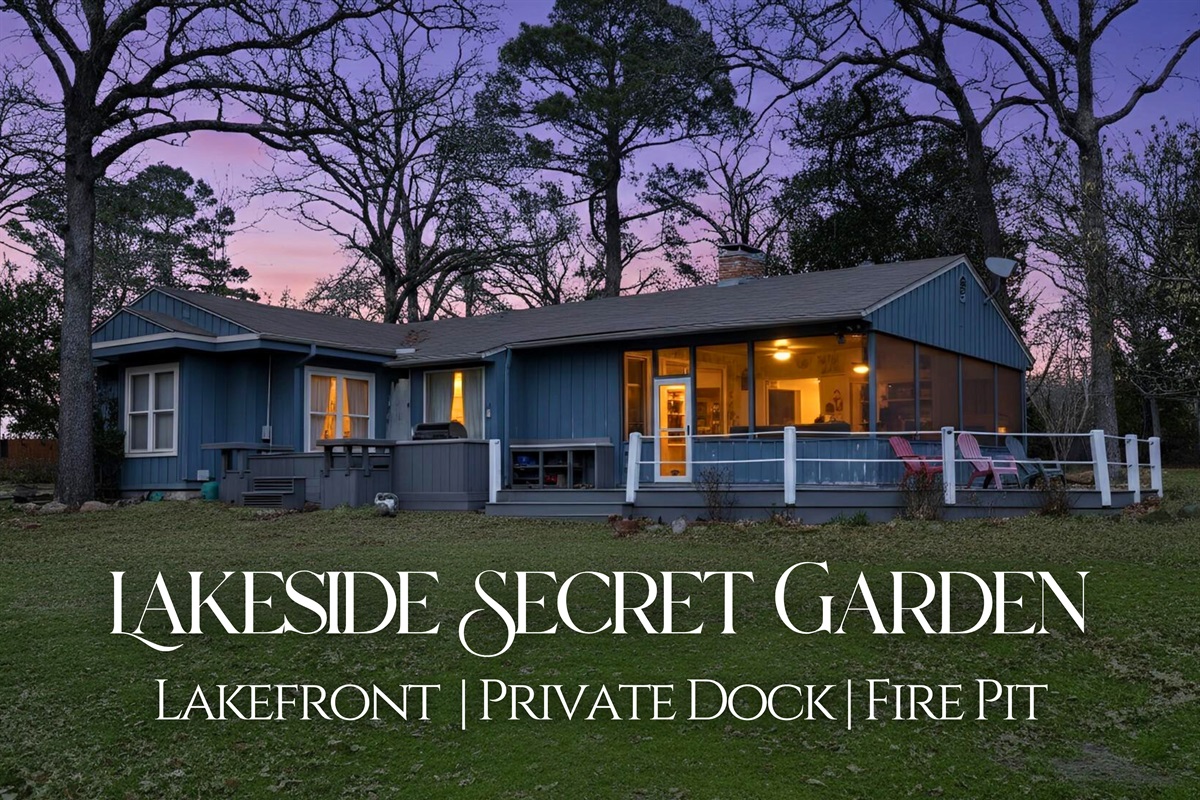 Lakeside Secret Garden is a breathtaking lakefront retreat in West Tawakoni, TX, offering nearly three acres of peaceful surroundings, stunning water views, and endless outdoor fun. Wake up to the sound of birds, sip coffee on the deck as deer roam the property, and spend your days enjoying the private sandy beach, dock, and two boat lifts for easy water access. Whether you're paddling out on a canoe, soaking in the built-in hot tub, or gathering around the fire pit under the glow of string lights, every moment here is designed for connection and relaxation. The screened-in porch provides a cozy space to play games, enjoy a meal, or simply take in the tranquil scenery.